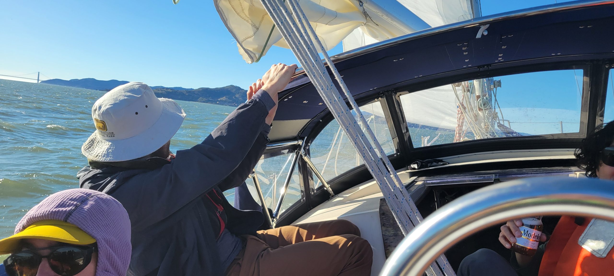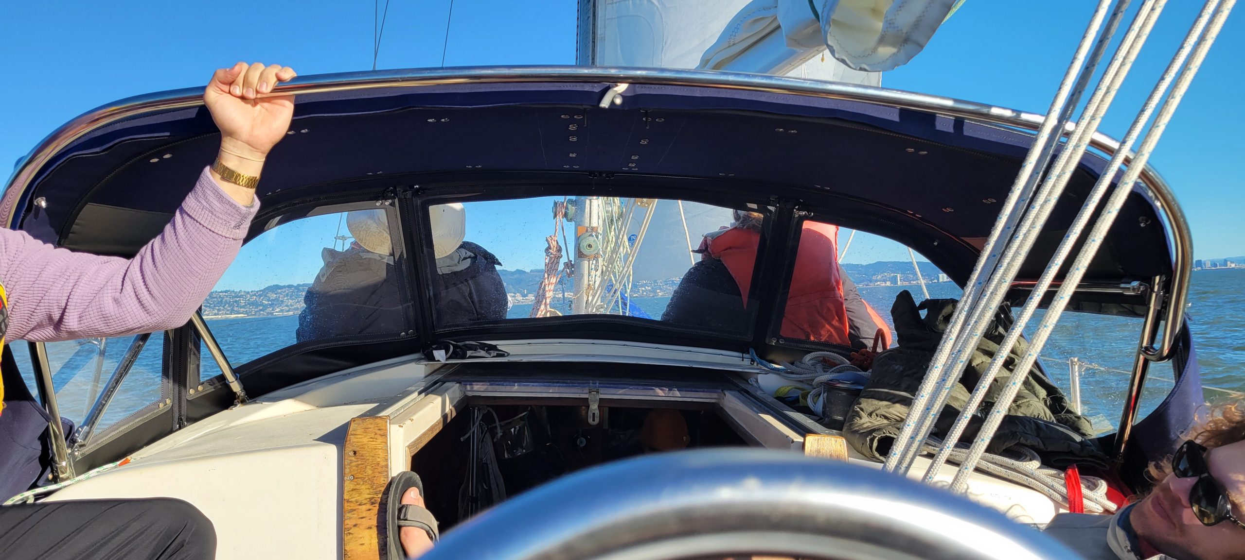 While reefing helps keep the boat level and the mast attached, it won’t keep the cockpit comfortable when waves splash over the bow of even the driest sailboat. That’s where my new dodger has transformed the experience. Now, heavy weather days have become my favorite time to sail. With two reefs in the main, a sliver of jib, and a protected cockpit, we’re comfortable in conditions that keep most boats at the dock. Case in point: on December 16, 2024, while tornadoes were battering Scotts Valley, we were in our own personal Caribbean on Yakamoz. We’d put the mighty third reef in at the dock, and sailed with an orange yankee cut heavy weather jib. We were alone in the bay, sipping hot chocolate and solving the world’s problems in our sheltered six-person cockpit.